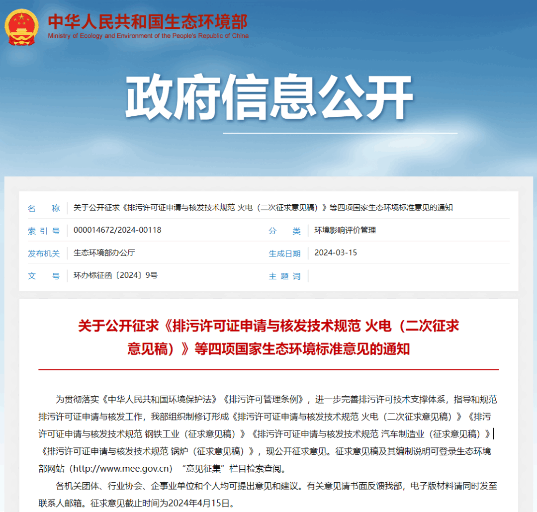 為貫徹落實《中華人民共和國環(huán)境保護(hù)法》《排污許可管理條例》,進(jìn)一步完善排污許可技術(shù)支撐體系,指導(dǎo)和規(guī)范排污許可證申請與核發(fā)工作,生態(tài)環(huán)境部組織制修訂形成《排污許可證申請與核發(fā)技術(shù)規(guī)范 火電(二次征求意見稿)》《排污許可證申請與核發(fā)技術(shù)規(guī)范 鋼鐵工業(yè)(征求意見稿)》《排污許可證申請與核發(fā)技術(shù)規(guī)范 汽車制造業(yè)(征求意見稿)》《排污許可證申請與核發(fā)技術(shù)規(guī)范 鍋爐(征求意見稿)》。征求意見截止時間為2024年4月15日。